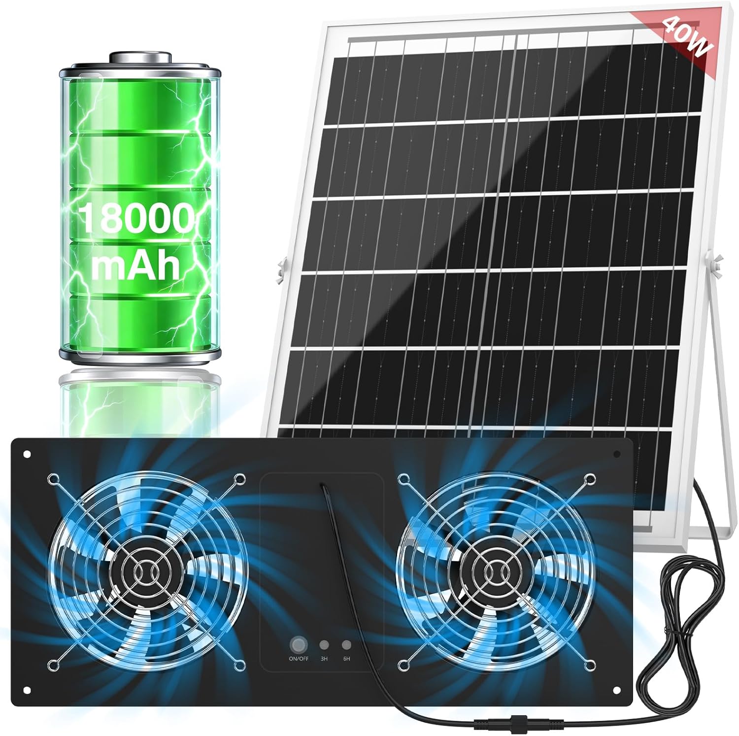 Introducing the 40W Solar Powered Exhaust Fan, a revolutionary solution designed to enhance ventilation in various environments such as chicken coops, greenhouses, sheds, pet houses, and windows. This high-performance fan operates at an impressive 3500 RPM, ensuring optimal air circulation to maintain a healthy and comfortable atmosphere for your animals and plants. With its robust 18000mAh battery, this fan guarantees reliable operation even on cloudy days, making it an essential addition to your outdoor spaces.