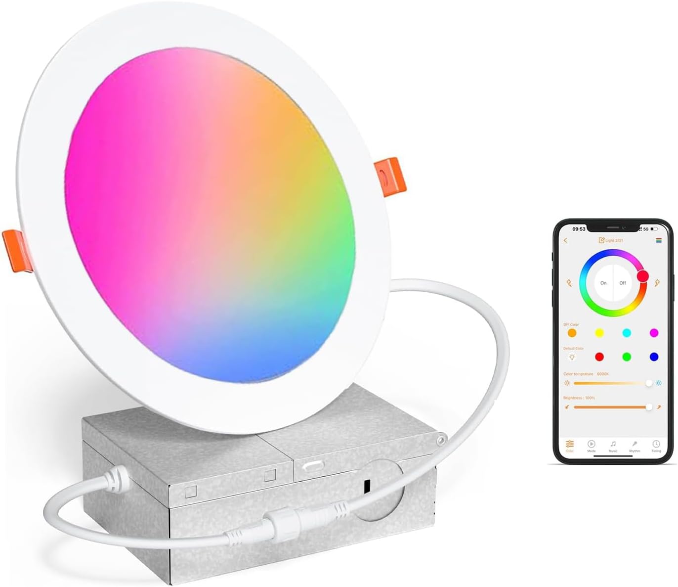 6 Inch LED Recessed Light 16W RGBCW Recessed Ceiling Lights Dimmable by Alexa & APP, 2700K-6000K 1350LM Recessed Lighting with Junction Box,16 Million Colors, DIY Scenes, 23 Modes, 1 Pack