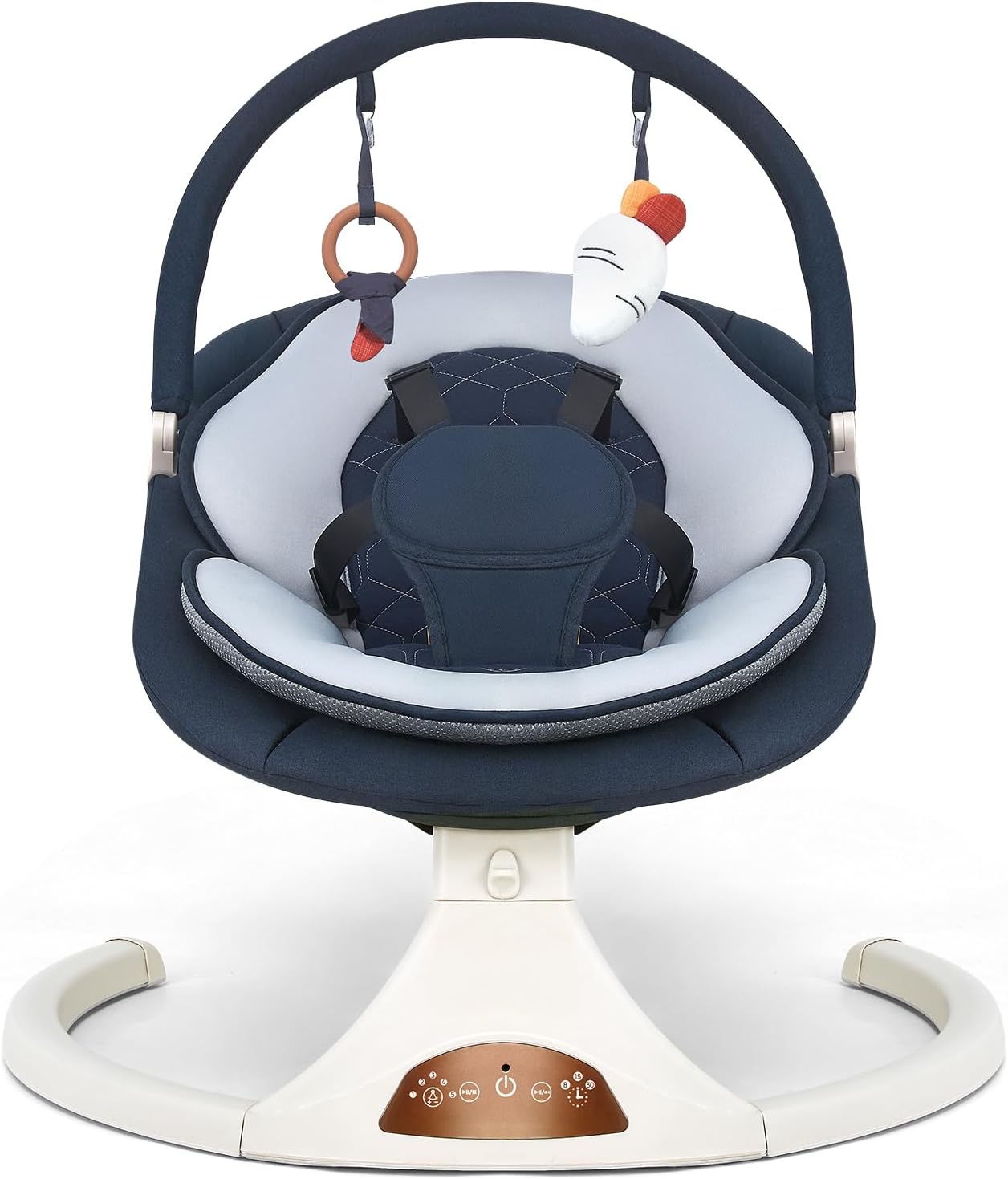 Introducing the ultimate solution for soothing your little one: the Electric Baby Swing for Infants to Toddlers. Designed with both comfort and convenience in mind, this swing features five adjustable speeds, allowing you to customize the rocking motion to suit your baby’s preferences. Whether your child enjoys a gentle sway or a more vigorous motion, this swing adapts to their needs, ensuring a peaceful and calming experience. The sleek dark blue design adds a touch of elegance to any room, making it a stylish addition to your home.