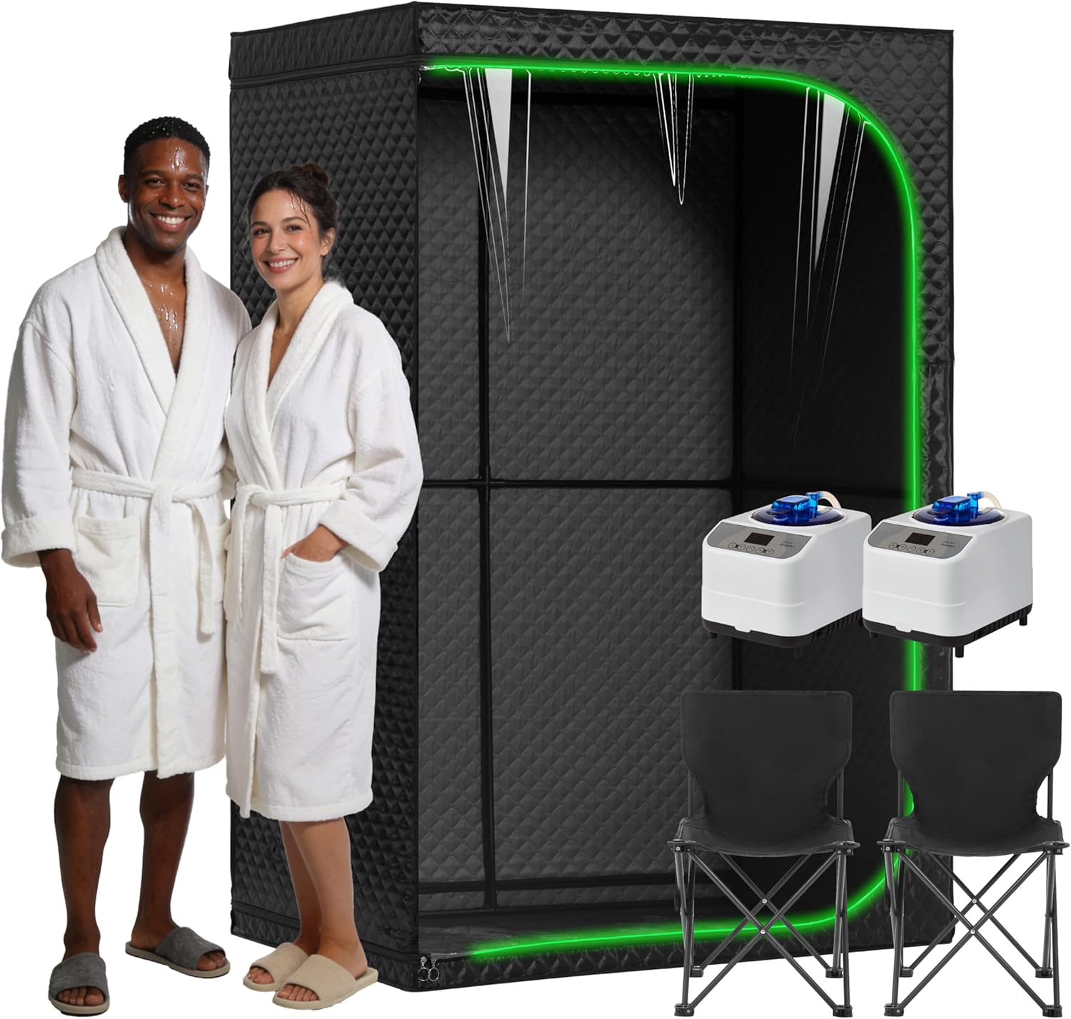 Double Steam Sauna Tent for Two, 2X 3L Steam Machines, 1500W Each, Foldable Home Spa Cabin with Chairs & Foot Mats, Adjustable 45–50°C, 5–60 Min Timer