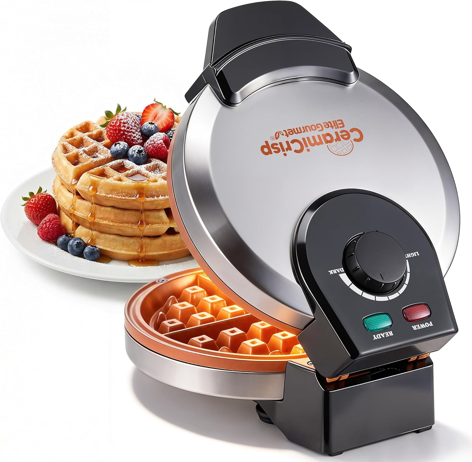 Elite Gourmet Belgian Waffle Maker with PFAS-Free CeramiCrisp™ Ceramic Nonstick Plates, Adjustable Browning Control, 1100W Heating, Power & Ready Indicator Lights, Vertical Storage, Stainless Steel