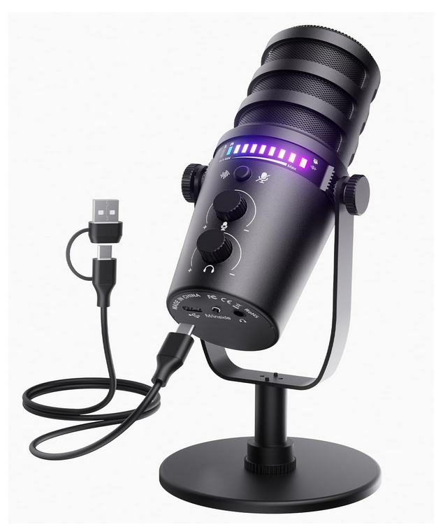 Gaming Microphone for PC, USB Computer Mic with Mute Button, LED Status Light, Gain Control and Headphone Jack, Plug-and-Play for Streaming, Discord, Twitch, YouTube, Podcast, Mac/Windows/PS5