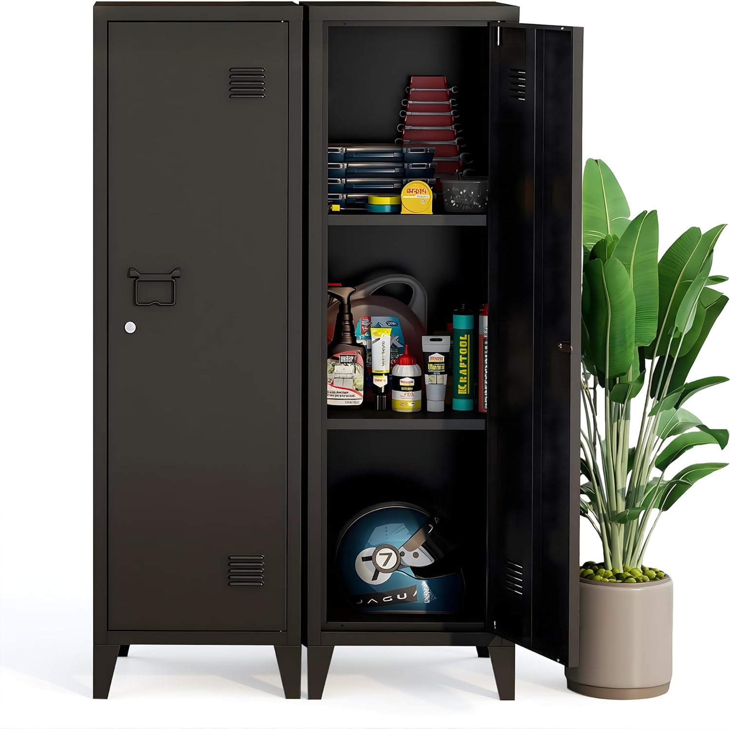 Equipped with a secure locking door, this locker cabinet provides peace of mind by keeping your belongings safe and organized. The interior features two spacious shelves, allowing you to customize the storage space according to your needs. Whether you need to store tools, files, or personal items, this cabinet offers ample room to keep everything neatly arranged and easily accessible. The adjustable shelves can accommodate various items, from books and office supplies to sports equipment and cleaning products.