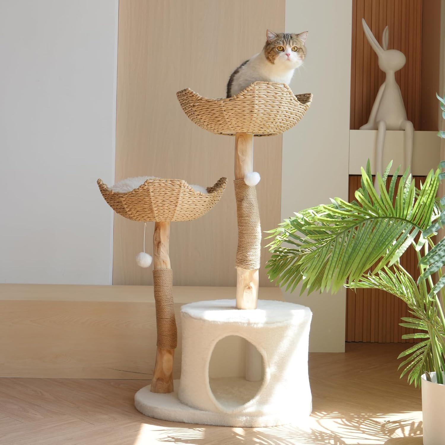 Natural Modern Cat Tree Tower – Wooden Cat Condo with Dangling Ball, Cozy Baskets, Scratching Posts, for Large Indoor Cats, Solid Wood Aesthetic Pet Furniture(43″ Tall)